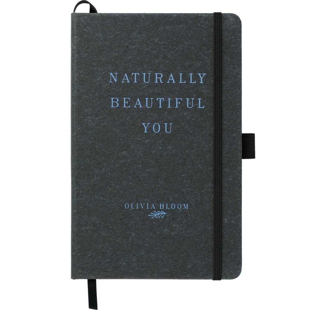 El cuaderno de notas encuadernado en cuero reciclado de 5.5 "x 8.5" presenta cuero reciclado, tapa dura con 80 hojas de papel FSC rayado. Cierre elástico a juego, lazo para bolígrafo y marcador de página con cinta. Bolsillo trasero para documentos.