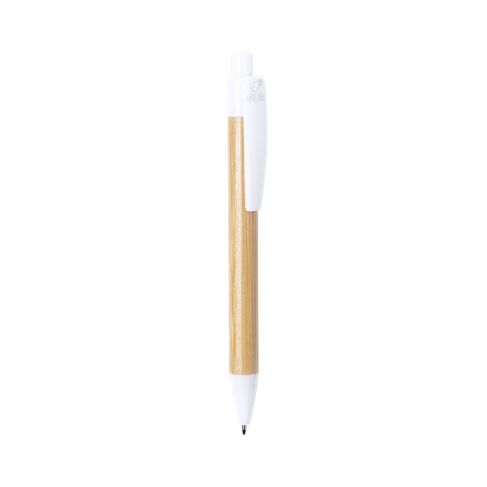 Bolígrafo de línea nature con mecanismo pulsador. Combinación de cuerpo en bambú brillo y accesorios en PLA -Ácido PoliLáctico-, que se obtiene a partir de recursos 100% naturales como el almidón de maíz, la yuca o la caña de azúcar, pudiendo convertirse en 100% compostable al final de su ciclo de vida útil.